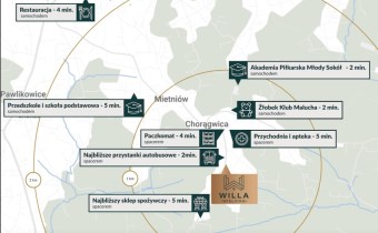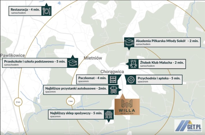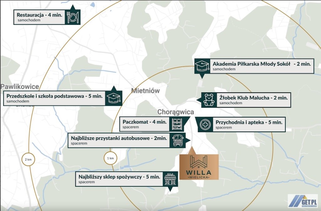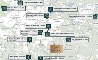 Lokalizacja łączy to, co najważniejsze, spokój i zielone otoczenie oraz szybki dojazd do Wieliczki, Krakowa, lotniska w Balicach i węzłów komunikacyjnych A4 i S7.