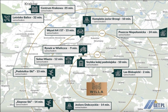 Optymalne połączenie z Krakowem zapewnia szybka kolej z Wieliczki (20 min na Dworzec Główny). A w najbliższej odległości od domu są: przystanek bus, paczkomat, przedszkole, szkoła.